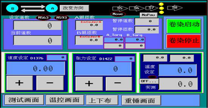 本系統采用張力閉環與速度閉環控制方式,同時加載了針對張力的專用算法。使卷染機真正達到恒張力,恒線速度,可以零張力(掉布)啟動,零張力正常運行。